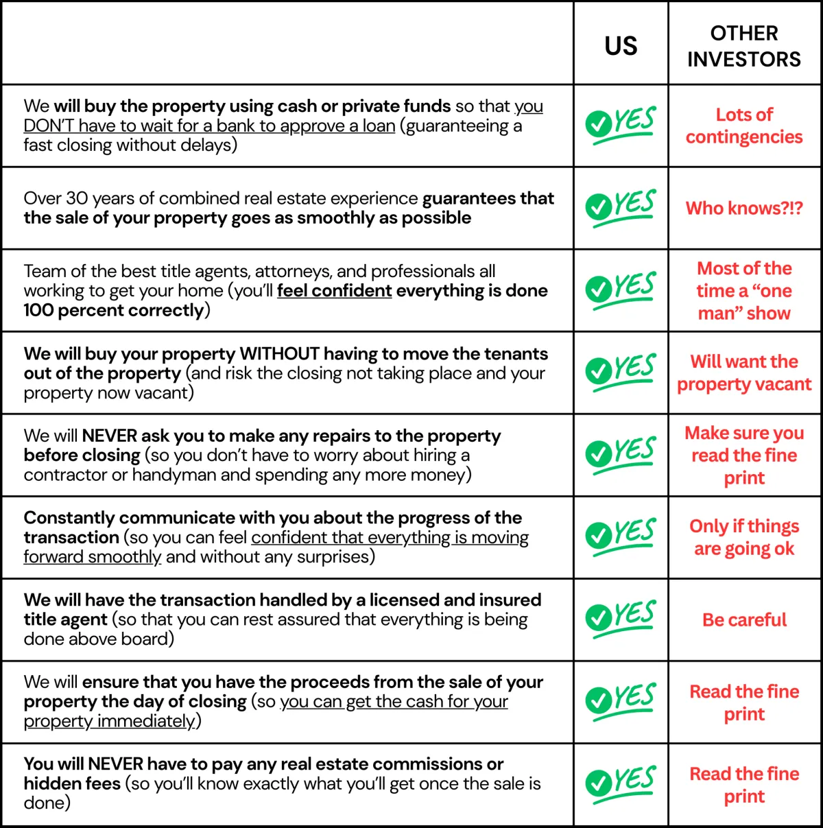 We’ll know very quickly if we can help you, and unlike selling through an agent, you don’t have to wait to see if the buyer can get financing… we’re ready to buy right now!